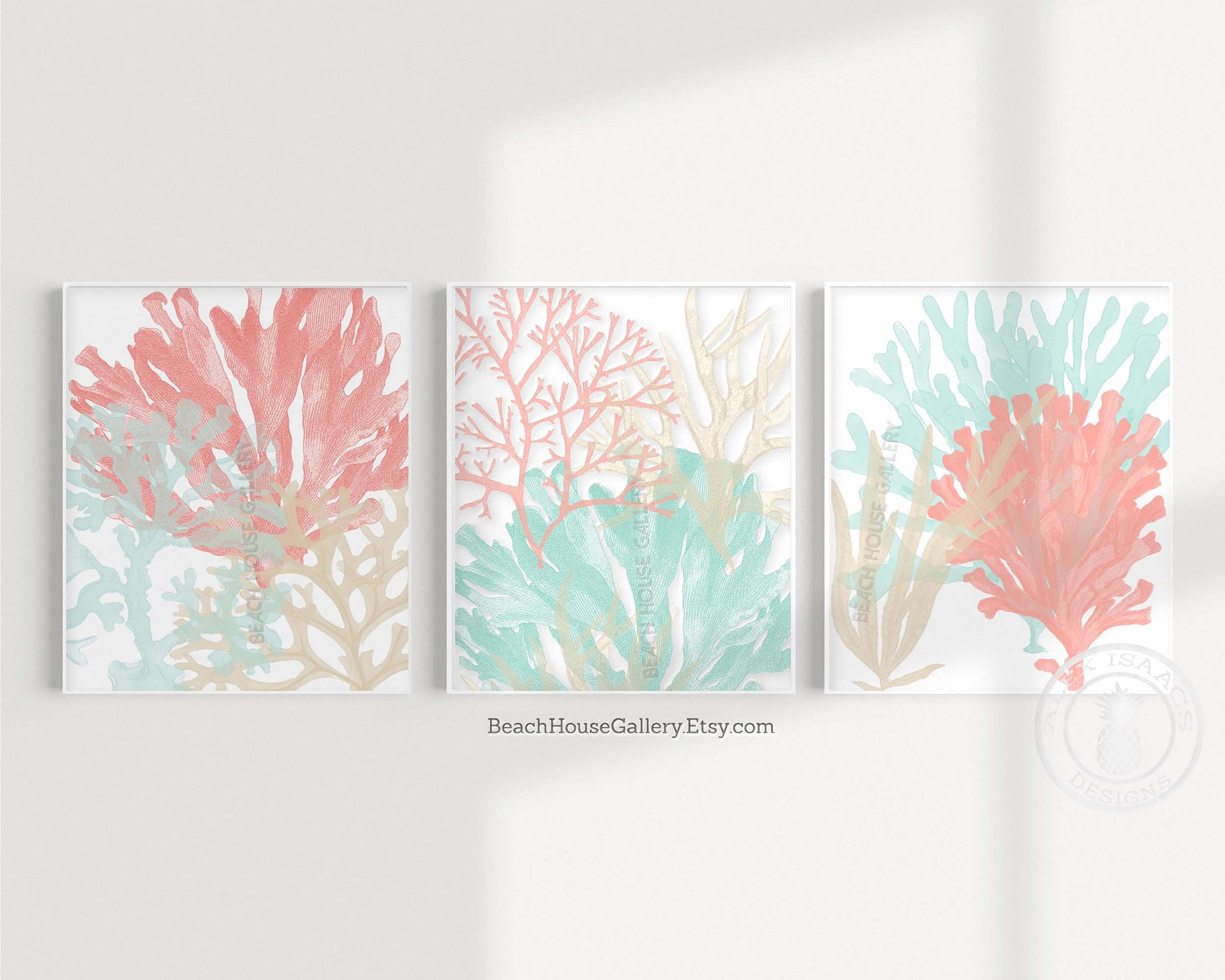 Coral Mint Tan Wall Art Coral Beach House Decor Bathroom Etsy Uk